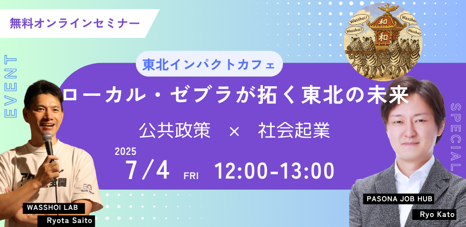 ゲストに株式会社パソナグループ・パソナJOB HUBの加藤氏と、株式会社Wasshoi Lab の齊藤にて、対談形式で現場の視点を交えたディスカッションを行います。今回のテーマは、「地域イノベーションと社会的投資」 ・「公共政策×社会起業」 ・「官民共創型ソーシャルインパクト戦略」このあたりを対話していければと思います。